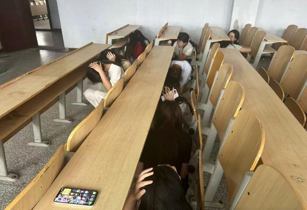 随着警报声的响起,防震疏散演练正式开始。在课堂上的教师迅速指挥学生躲避在课桌下,学生们动作迅速、姿势正确,用书本或书包护住头部,尽量蜷缩身体,降低重心,进行紧急避险。