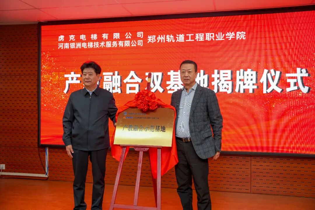 在全体参会人员的见证下,三组揭牌依次进行:学校理事长付全立与河南银洲电梯董事长杜战胜共同为“产教融合示范基地”揭牌;学校副理事长邢天来与虏克电梯营销总经理申营昌共同为“产教融合示范基地”揭牌;学校党委副书记刘艳萍与河南银洲电梯副总裁宋光华共同为“实习实训基地”揭牌,牌匾揭开的瞬间,现场掌声雷动,标志着三方合作正式落地。
