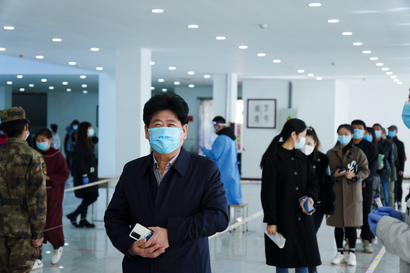 在校师生教职员工以处室、系部、班级为单位,错时错峰、密切配合,有序排队进行样本采集,现场出示健康码,佩戴口罩依次入场。在志愿者的引导下,每10人一组进入采样区,工作人员扫描身份证后即可进行样本采集。在采集过程中,医护人员细心操作,师生员工努力配合,采样工作快速有序推进。