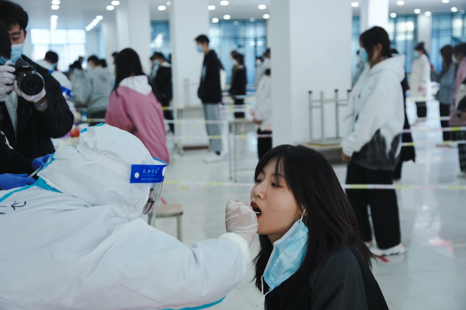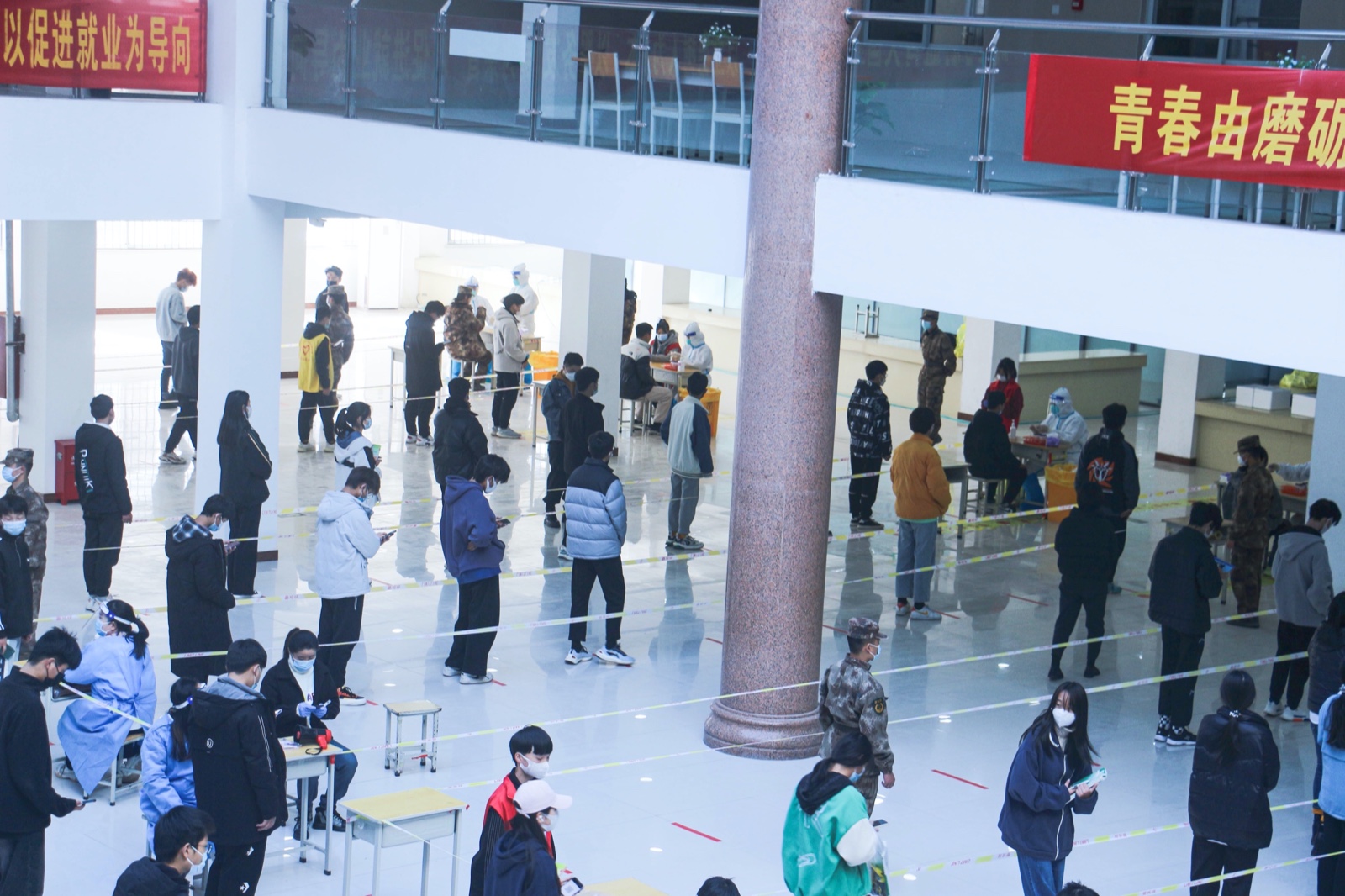 为进一步提升工作效率,本轮核酸检测在图书馆、行政楼共设置有21个核酸检测采样台,其中包括20个学生采样台,1个教职工采样台,严格按照防疫要求设立警戒线和1米距离分界线。各系、部、处室全力协助医务人员开展核酸采样工作。学院党委办公室,院长办公室,党委宣传部,学工部,校团委,后勤管理处,保卫处以及各系、部教师志愿者,学生志愿者们分工明确、各司其职,现场维持秩序并有效控制室内待检人员数量。