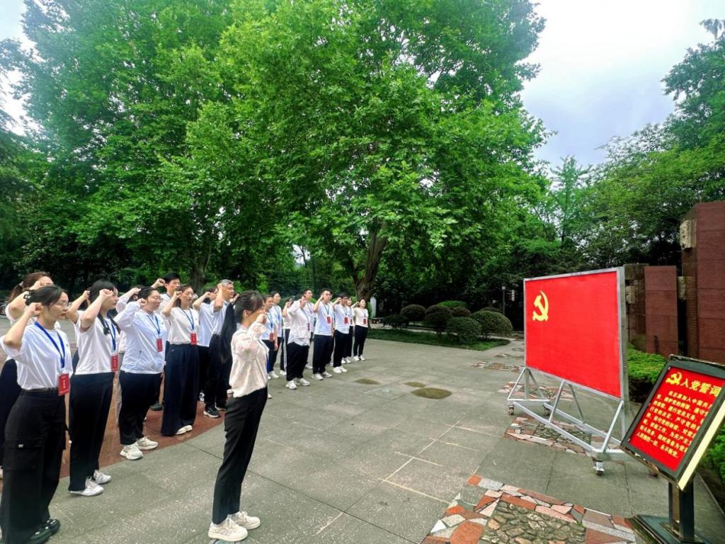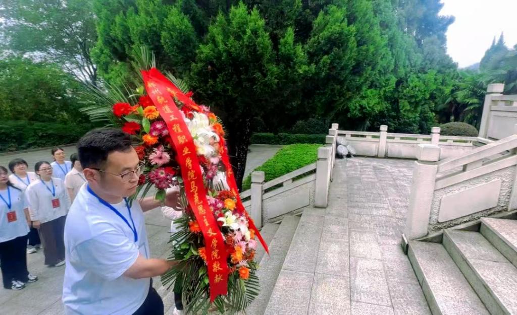 次日清晨,教师们怀着崇敬之心前往鄂豫皖苏区首府烈士陵园开展现场教学,站在苍松翠柏间,脚下的每一寸土地似乎都在无声地诉说九十多年前那段血与火交织的岁月。在庄严肃穆的氛围中,全体教师神情凝重,面对镌刻着13万烈士英名的纪念碑,敬献花篮,缅怀先烈,锤炼党性。在马克思主义学院党总支书记姚静华的领誓下,“我志愿加入中国共产党...”的铿锵誓言穿透云霄、激荡回响,与历史烽火中的初心使命形成强烈共振。