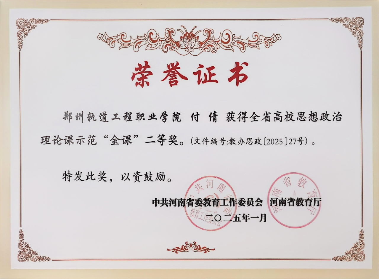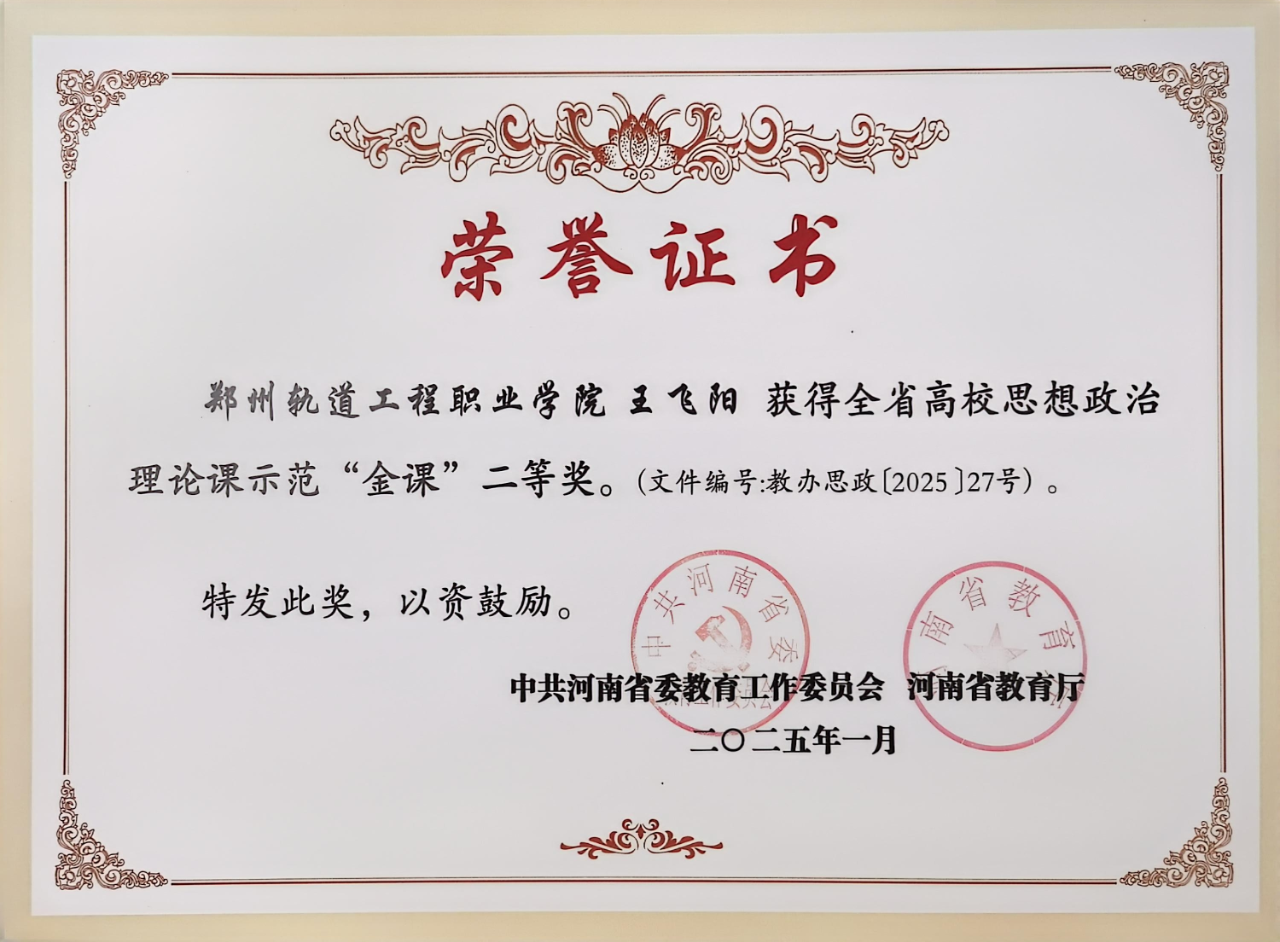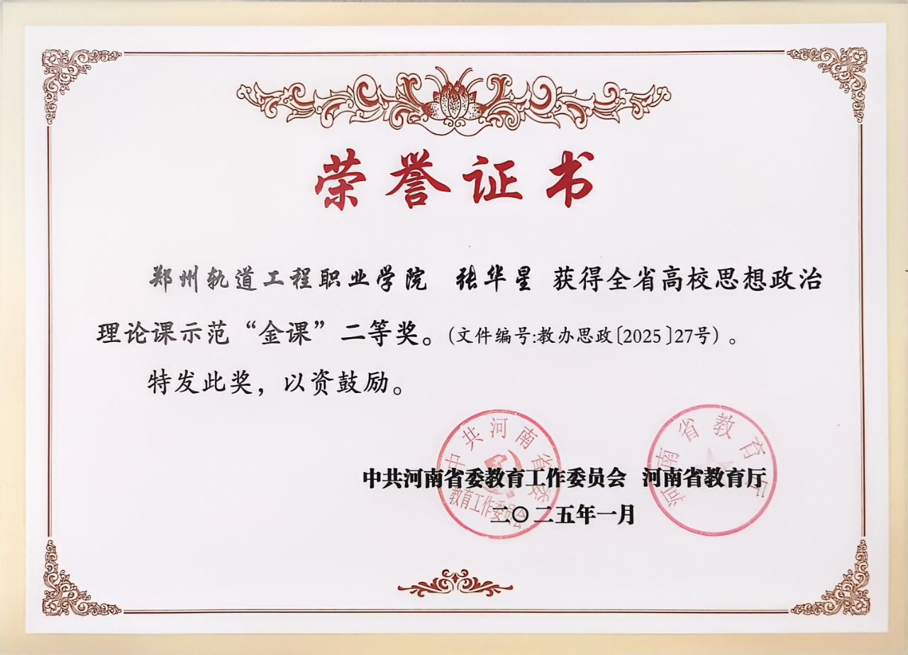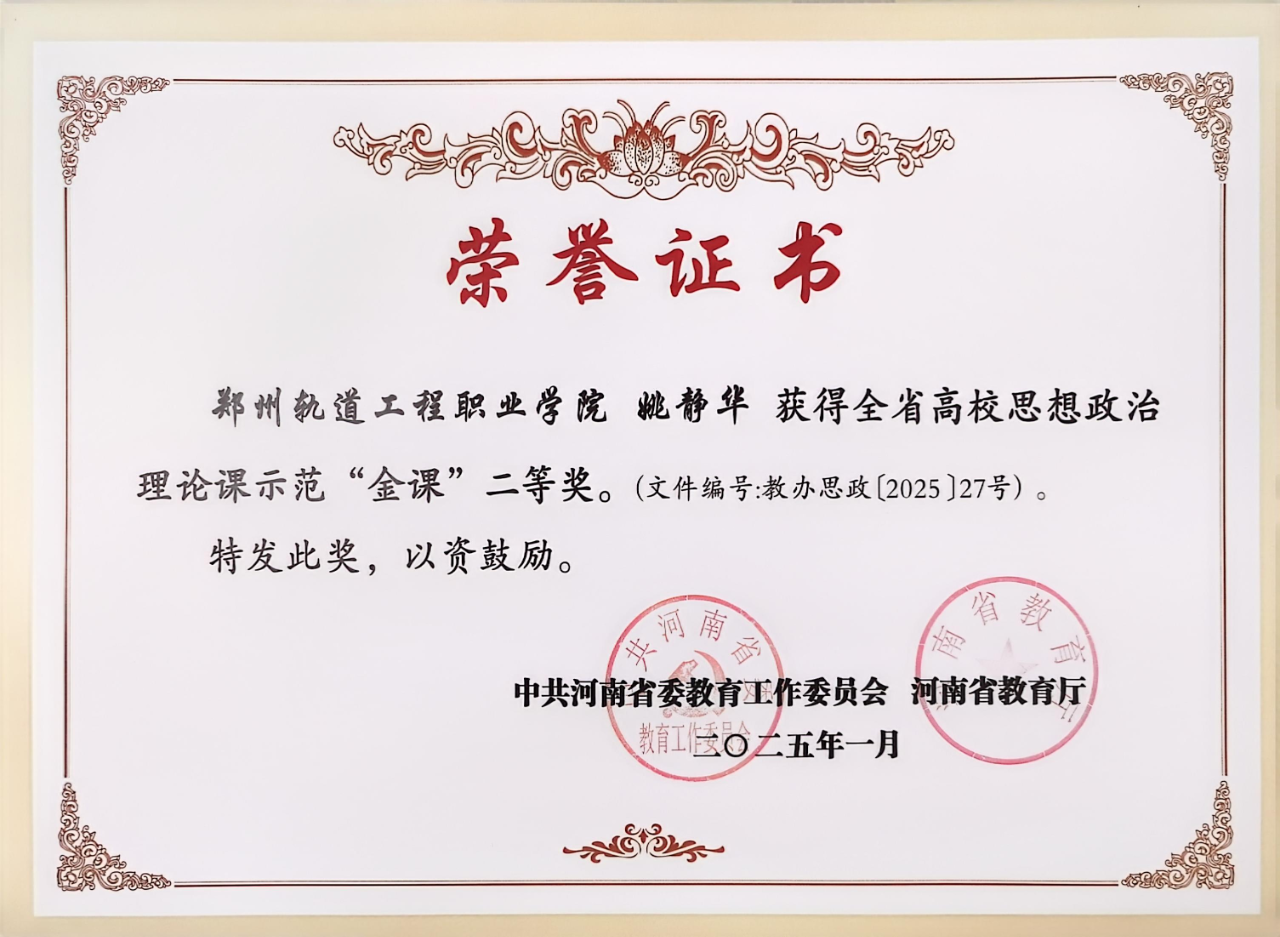思政铸魂启智光,金课新章誉四方。近日,河南省教育厅公布《河南省教育厅办公室关于公布河南省高校思政课优秀课程资源评选结果的通知》(教办思政〔2025〕27号),我校马克思主义学院申报的《习近平新时代中国特色社会主义思想概论》、《毛泽东思想和中国特色社会主义理论体系概论》、《思想道德与法治》、《形势与政策》四门思政必修课程全部获奖,均被评选为全省高校思想政治理论课示范“金课”,其中姚静华荣获“习近平新时代中国特色社会主义思想概论”示范“金课”二等奖,王飞阳荣获“形势与政策”示范“金课”二等奖,张华星荣获“毛泽东思想和中国特色社会主义理论体系概论”示范“金课”二等奖,付倩荣获“思想道德与法治”示范“金课”二等奖。据了解,在全省114所专科高校四门思政必修课程全部获奖的仅有25所,在35所民办高校中仅有4所。