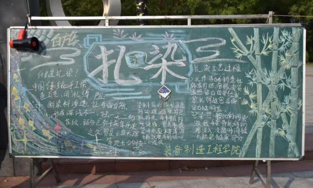 活动现场,学生干部通过黑板报与讲解,系统介绍了扎染的历史渊源、制作工艺及苗族、白族等民族的特色扎染文化。从“扎缚松紧”“染液时长”等技艺要点,到“螺旋纹”“几何纹”等图案设计,师生们边听边实践,在布料上尝试创新表达。“一块白布能变成独一无二的艺术品,就像56个民族各有特色,却共同绘就中华文化的绚丽画卷。”一名参与学生感慨道。
