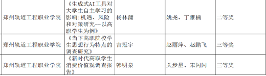 2025年9月4日,河南共青团发布了《关于第十七届“挑战杯”河南省大学生课外学术科技作品竞赛拟获奖作品的公示》,此次竞赛工作由团省委、省教育厅、省社科院、省科协、省学联联合开展,经网络初审和现场决赛评审,我院姚尧、丁雅楠作为指导老师的作品《生成式AI工具对大学生自主学习的影响:机遇、风险和对策研究--以高等职业学生为例》荣获二等奖,这标志我院在该项竞赛上取得了新的突破性成绩,也是学校首次在此项目上获得的最高荣誉。另外,赵丽萍、赵鹏飞作为指导老师的作品《当下高职院校学生思想行为特点的调查研究》荣获三等奖;关步星、宋闪闪作为指导老师的作品《新时代高职学生消费价值观调查报告》荣获三等奖。