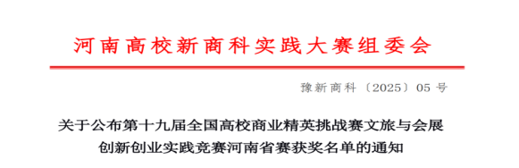 近日,作为河南省高等学校大学生学科竞赛省级竞赛项目(B类)的2025年全国高校商业精英挑战赛文旅与会展创新创业竞赛河南省赛成绩揭晓。我院选派的多支参赛团队在指导老师的悉心指导下,凭借出色的创新与实践能力,在这一高规格、高水平的省级学科竞赛平台上脱颖而出,共荣获二等奖五项、三等奖三项的优异成绩,充分彰显了我院在应用型人才培养方面的扎实成效。
