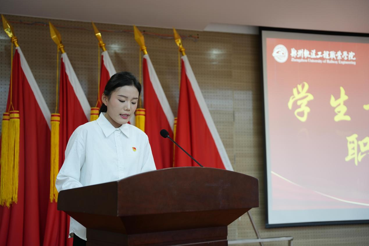 随后,会议进入学生干部述职与任职环节。第四届团总支学生书记任梦昕系统回顾了以往的工作历程,从思想引领、组织建设、志愿服务等多个维度总结了取得的成绩与存在的不足;第四届学生会主席赵培淇则聚焦学生会在制度建设与活动开展等方面的探索实践,寄语新成员永葆初心、勇担使命。紧接着,第五届团总支学生书记任梦晗在任职报告中表示,将重点从“深化思想引领”与“强化能力提升”两个维度开展工作;新任主席团代表范家欣则强调会在继承优良传统的基础上锐意创新,全力开创团学工作新局面。