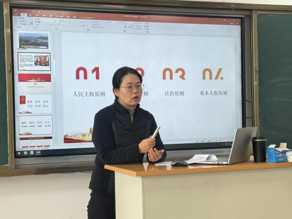 党课上,陈春燕围绕习近平法治思想的核心要义与实践要求,系统梳理并阐述了四个方面的重点内容:在“依法治国路程”部分,她回顾了我国法治建设从探索起步到全面推进的历史脉络,并结合新时代全面依法治国取得的历史性成就,阐释了中国特色社会主义法治道路的独特优势与实践意义;在“党章修订草案”部分,她重点解读了修订的时代背景、核心要义与实践要求,强调党章作为党的总章程,是全体党员必须共同遵循的根本行为规范;在阐述“宪法的重要性”时,她突出宪法作为国家根本法的权威地位,指出宪法是党和人民意志的集中体现,必须始终维护宪法权威、保证宪法实施;结合“习近平总书记谈民法典”,她深入解读了民法典坚持“以人民为中心”的核心价值与制度意义,使党员们深刻理解民法典作为“社会生活的百科全书”的重要作用。