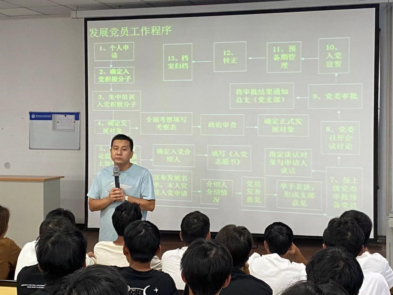 党的理论知识是我们坚定信仰的基石,是我们前进道路上的明灯。为开展好此次活动,支部提前筹划,严格落实。党总支书记刘开洋为大家讲解了党的理论知识。他以深入浅出、生动形象的方式,结合大学生实际情况,为大家传递党的初心和使命,帮助大家更好地理解党的基本知识和基本理论。全体新生积极参与,在学习理论知识的同时汲取党的智慧,坚定理论信仰。