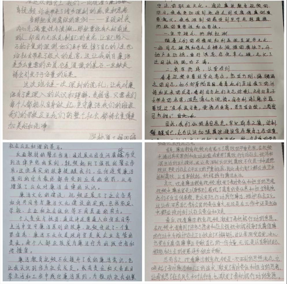 在之后的深入讨论中,学生们不仅就如何在生活中践行廉洁自律分享了见解,还纷纷提笔记录下自己的感悟,他们深知廉洁自律不仅是对法规的遵守,更是日常行为的自我规范,如诚实守信、公平竞争、拒绝浪费。这些感悟成为他们心中的灯塔,照亮了前行的道路,激励着他们在未来的学习和生活中,始终保持清醒的自我认知和高尚的行为准则。