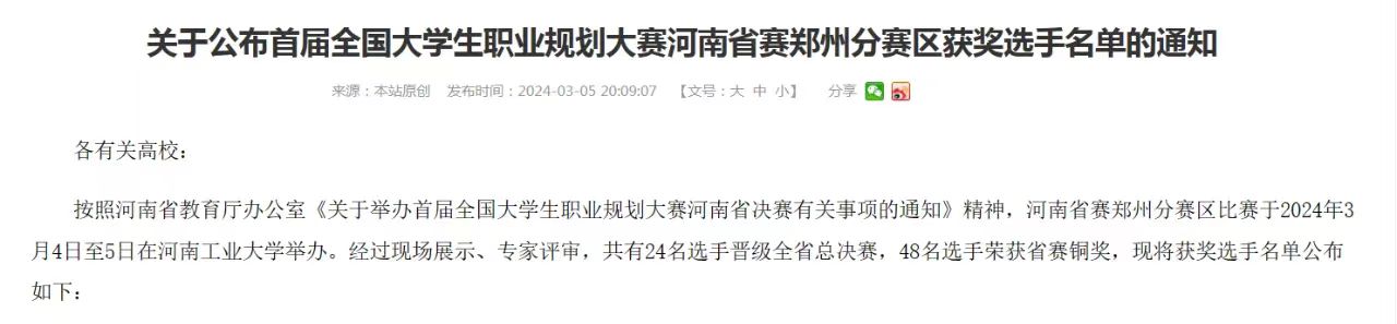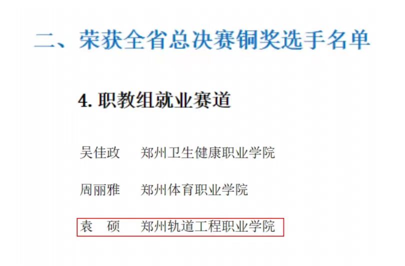 3月5日,河南省毕业生就业信息网发布了《关于公布首届全国大学生职业规划大赛河南省赛郑州分赛区获奖选手名单的通知》,我校轨道工程学院22级学生袁硕荣获首届全国大学生职业规划大赛河南省赛郑州分赛区职教组就业赛道总决赛铜奖。