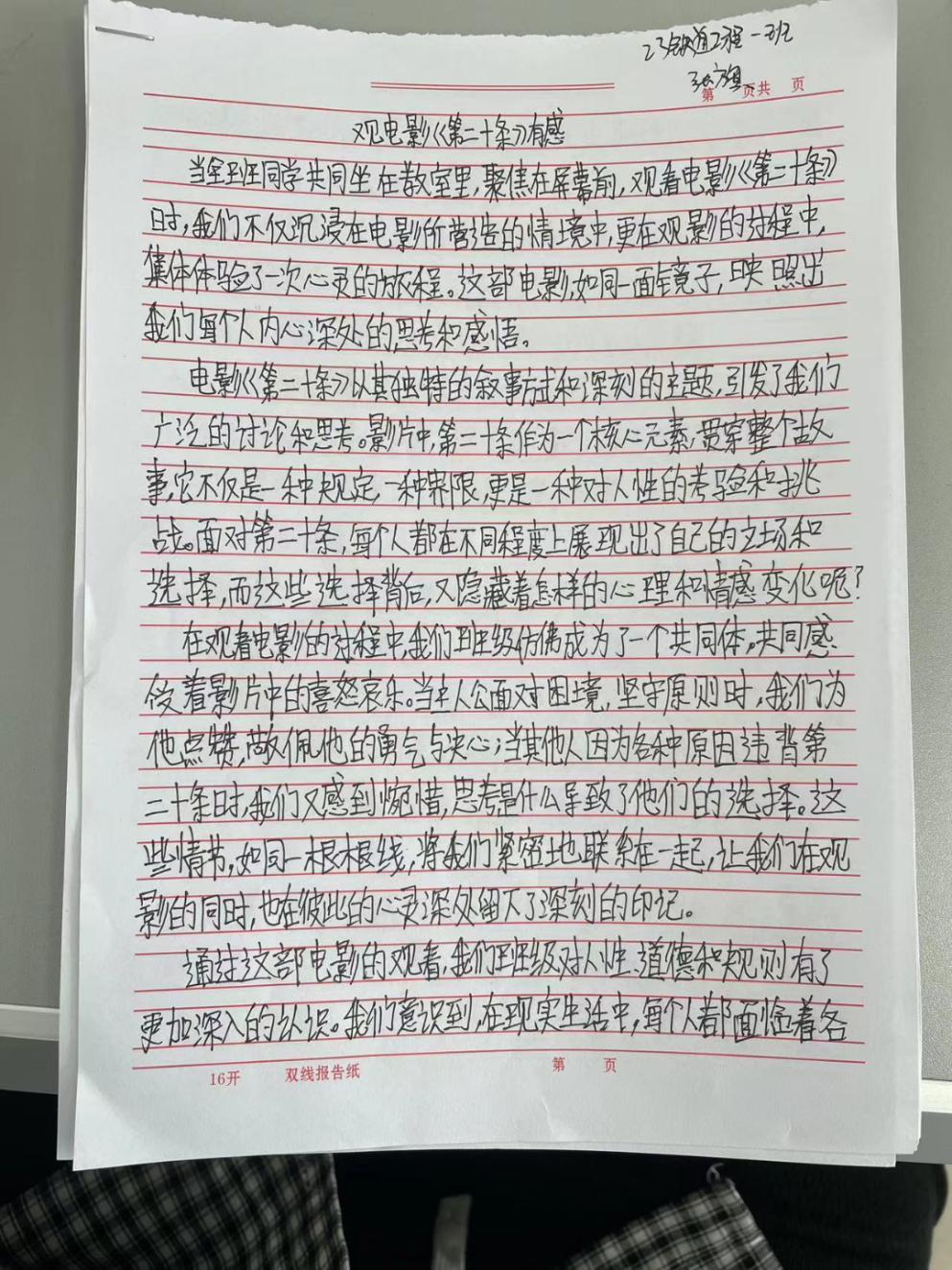 为了丰富学生的课余生活,增强学生的廉洁意识,轨道工程学院特地组织了一次观影活动,全体学生共同观看了电影《第二十条》。这部电影以其深刻的主题和精彩的剧情,引发了师生们的广泛讨论和深入思考。