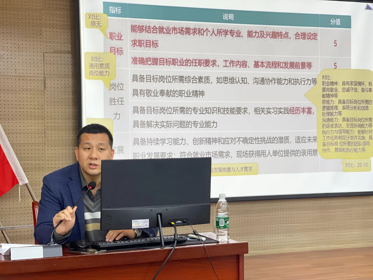 刘开洋解读了职业规划大赛文件精神,细致入微剖析了大赛评分规则、比赛流程、制作参赛作品PPT、规划书、回答评委提问环节的方法和技巧,为台下学子们呈现了一场别开生面的分享会。