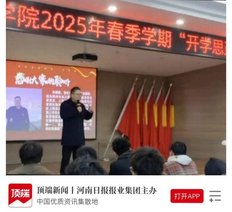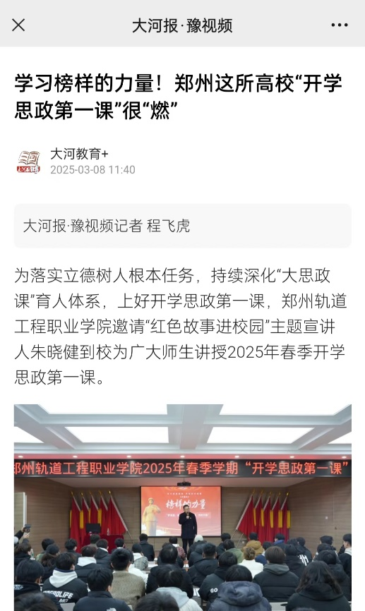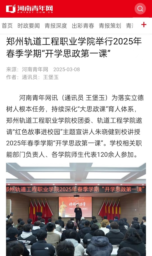 近日,由轨道工程学院协办的“郑州轨道工程职业学院开学思政第一课”成功举办,引发热烈反响,大河报、河南青年网、顶端新闻等各大媒体纷纷对此进行报道。此次开学思政第一课邀请了“红色故事进校园”主题宣讲人朱晓健老师,为全校师生带来了一场精彩且深刻的精神洗礼。