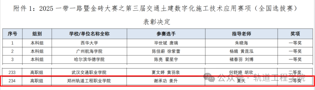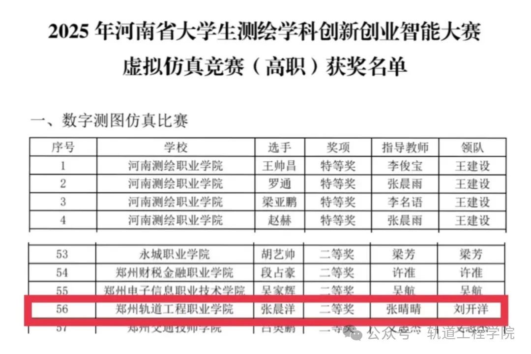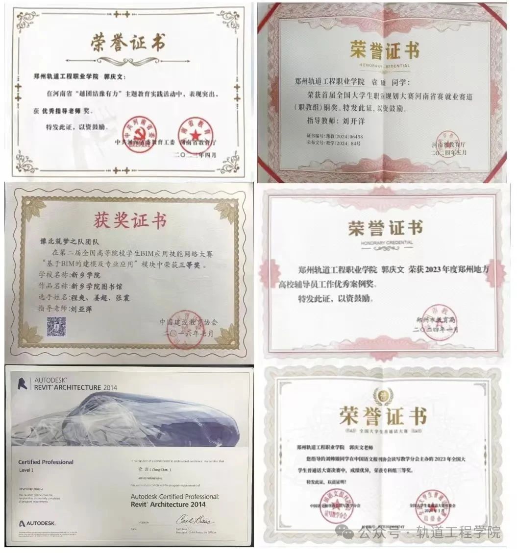 轨道工程学院师生在全国大学生职业生涯规划大赛、2025年河南省大学生测绘学科创新创业智能大赛、2025一带一路暨金砖国家技能发展与技术创新大赛等竞赛中屡获佳绩。学院教师取得职业技能等级证书10余项。
