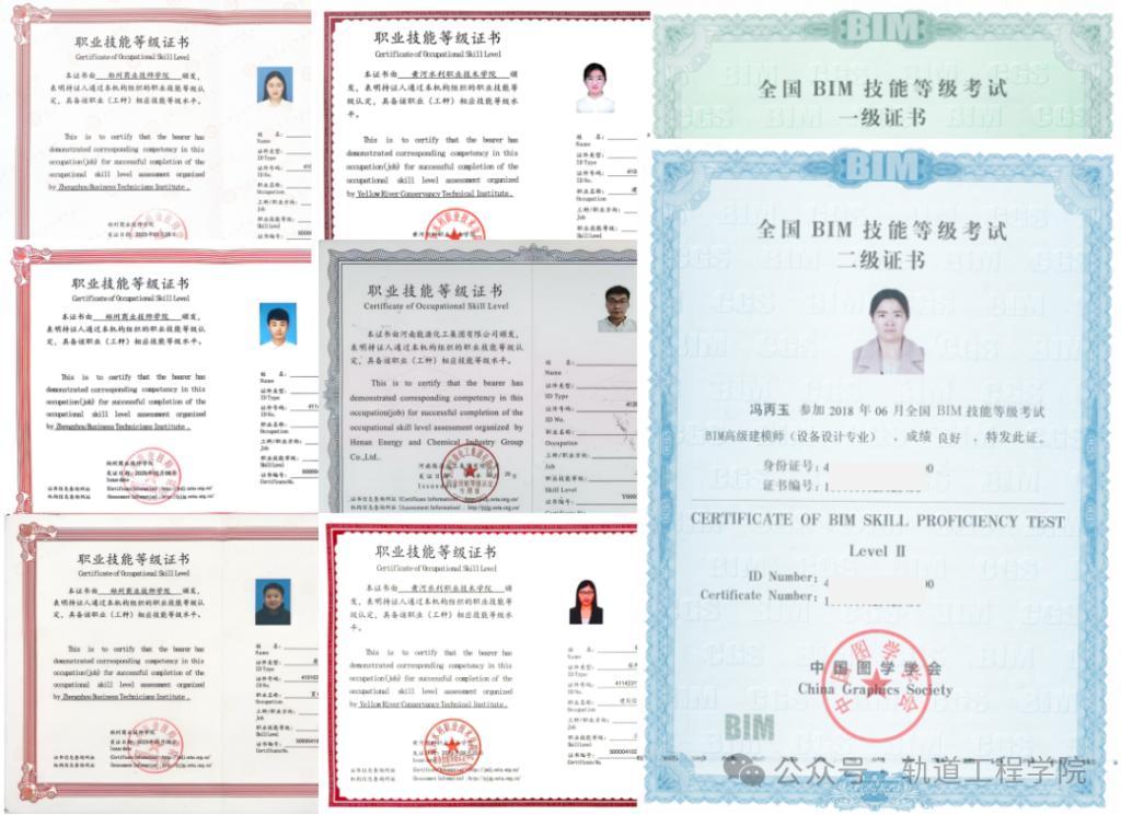 【职业资格证书或技能等级证书】工程测量员证、试验员证、质检员证、施工员证、安全员证、造价员证、资料员证、探伤证、桥隧工证、建筑信息模型(BIM)证等。