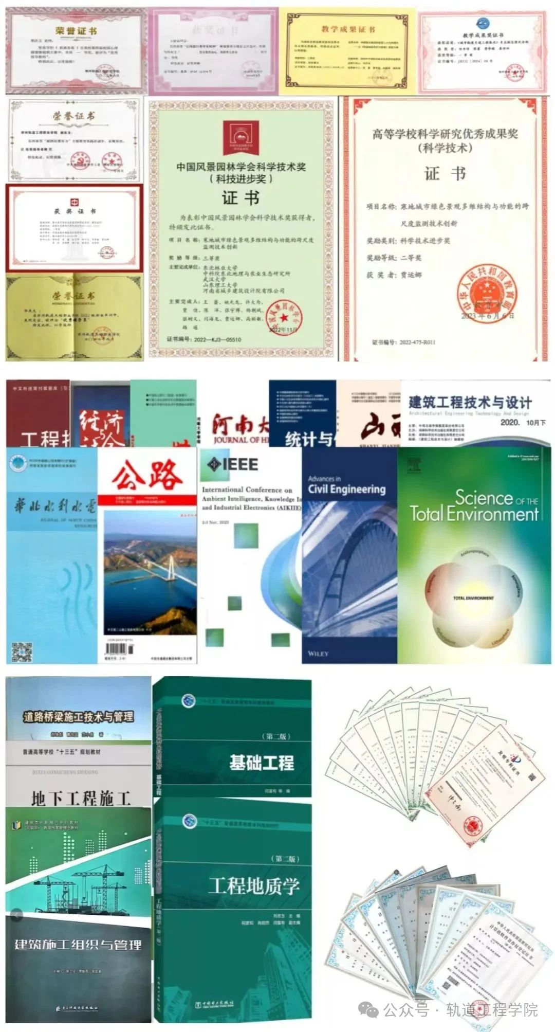 学院先后承担河南省高等学校重点科研项目、河南省教学改革研究项目、河南省教育科学规划课题等40余项。获教育部颁发高等学校科学研究优秀成果奖二等奖、首届全国大学生职业生涯规划大赛铜奖、第十届河南省土木建筑科学技术奖、郑州市优秀教学成果二等奖等10余项。教师主编、合编出版教材6部。公开发表教科研论文100余篇。申请软件著作权10项。授权专利20余项。2024年12月,专业:城市轨道交通工程技术(轨道智能检测方向)获郑州地方高校战略新兴专业建设点。
