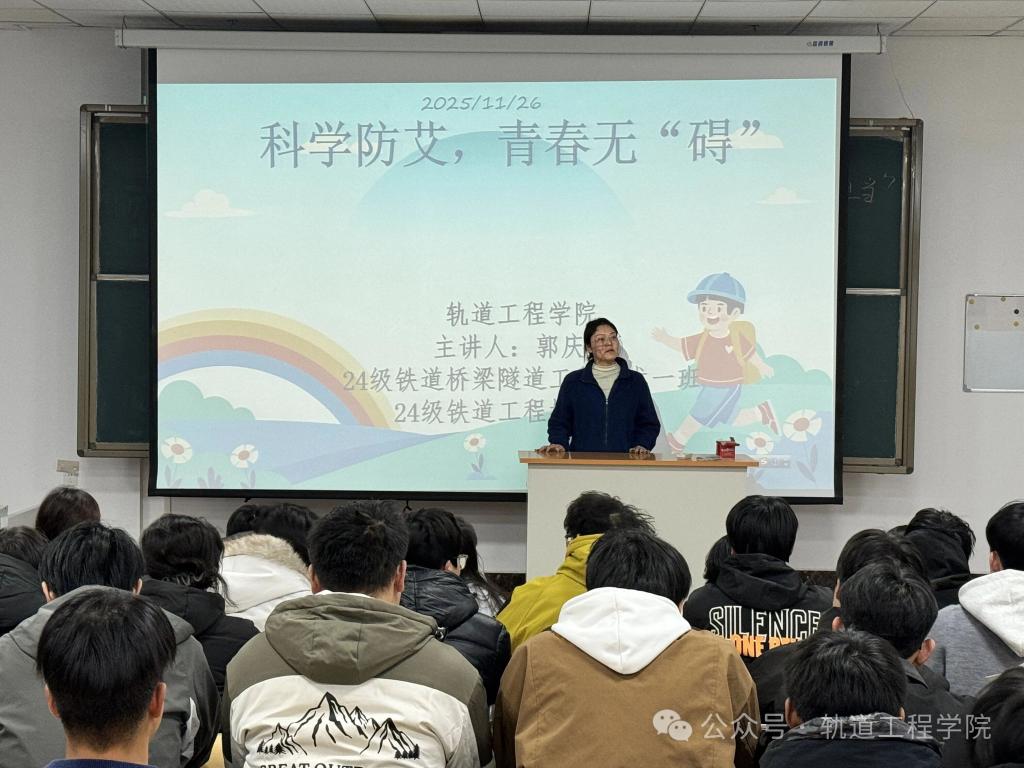 2025年12月1日是第38个“世界艾滋病日”,为深入贯彻落实《“十五五”国民健康计划》精神,进一步增强大学生对艾滋病防治知识的了解,树立科学防艾理念,消除对艾滋病感染者的歧视,营造健康、平等、和谐的校园环境,轨道工程学院于2025年11月27日,组织全院各班级开展了以“科学防艾,青春无‘碍’”为主题的班会活动。