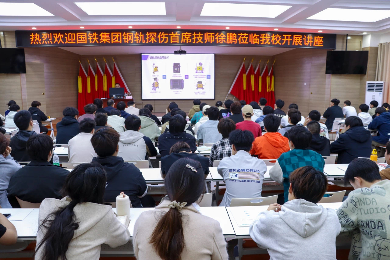 讲座中,徐鹏大师分享了个人从基层技术员成长为首席技师的职业历程,结合自身丰富的钢轨探伤从业经验,讲解了钢轨探伤的应用技术。他强调,钢轨探伤是保障铁路运输安全的关键环节,从业者需以“零误差”标准要求自身,将责任心与技术创新紧密结合。同时并寄语青年学子:工匠精神不仅是技艺的极致追求,更是对行业安全与社会责任的高度敬畏。希望同学们扎实锤炼本领,为中国轨道高质量发展贡献力量。