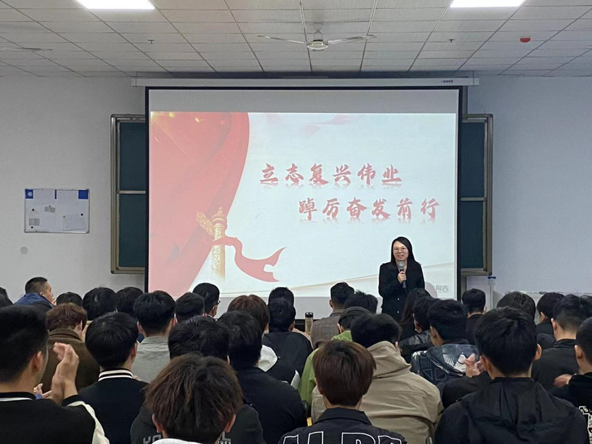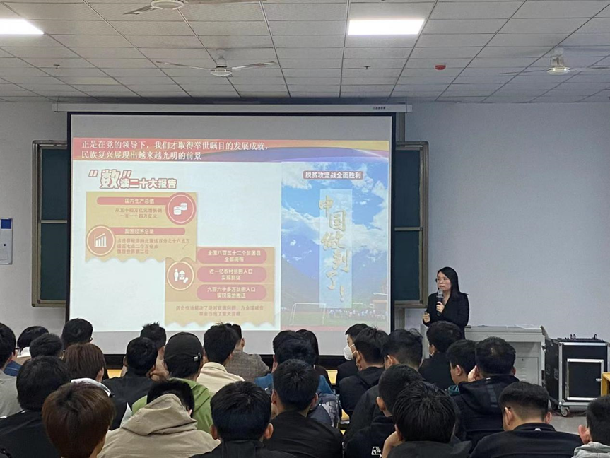宣讲会上,柴老师从“永载史册的伟大变革”、“引领复兴的宏伟蓝图”、“笃行不怠的战略定力”三个方面进行讲解,鲜明阐述了“立志复兴伟业 踔厉奋发前行”,使师生们更加深入学习了党的二十大精神。现场气氛热烈,师生情绪高涨。最后,柴老师鼓励老师和同学们在今后的工作和学习中发扬自信自强、守正创新,踔厉奋发、勇毅前行的精神状态,在新时代新征程上赢得更加伟大的荣光。