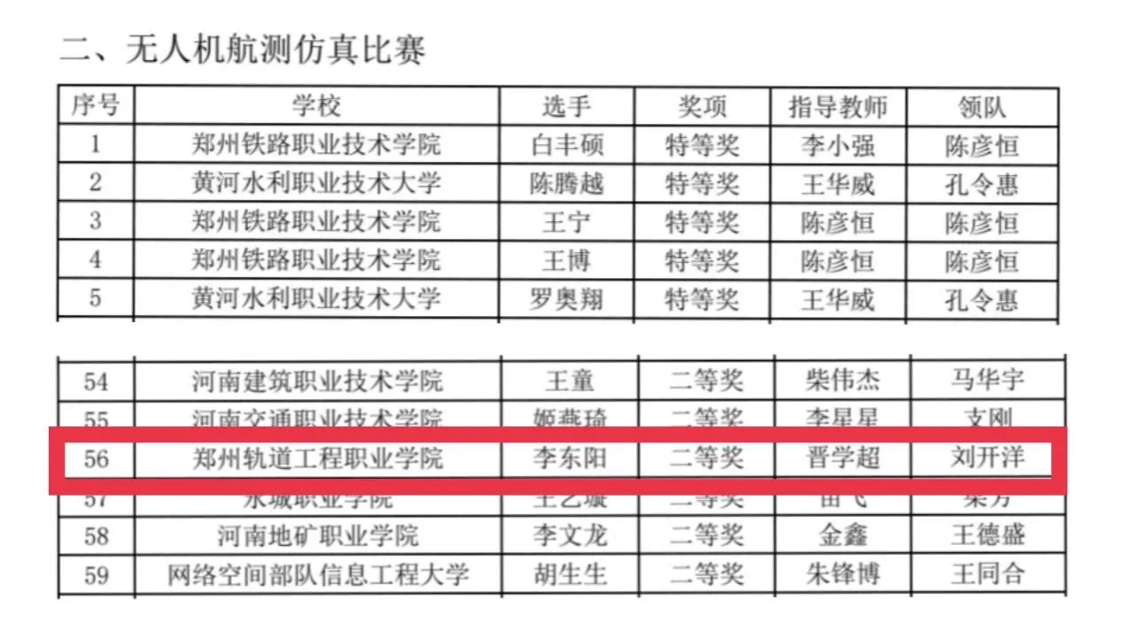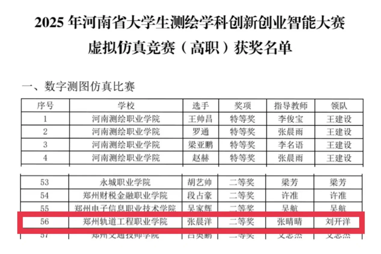 在5月16日至18日举办的“南方测绘杯”2025年河南省大学生测绘学科创新创业智能大赛中,轨道工程学院2名学子凭借扎实的专业技能和出色的发挥,在众多参赛选手中脱颖而出,斩获2项省级荣誉。其中,23级铁道桥梁隧道工程技术班张晨洋同学荣获数字测图仿真赛项省级二等奖,23级高速铁路施工与维护班李东阳同学荣获无人机航测仿真赛项省级二等奖。