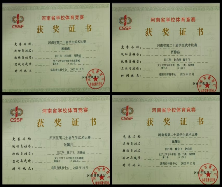 近日,由河南省教育厅主办的“河南省第二十届学生武术比赛”在千年古都、武术之乡洛阳落下帷幕。此赛事是省内面向学生群体规模最大、水平最高的武术赛事,共吸引了来自全省72所高校937名运动员、教练员参加,参赛人数和参赛单位均创历届新高。我校武术队凭借精湛的技艺、顽强的斗志和出色的发挥,在众多强手中脱颖而出,其中张馨月和贾静茹分别获得了省级拳术比赛第二名、第三名;张馨月获得省级传统长器械比赛第四名;宋焕然获得省级一类拳第三名;郭雨晨和贾静茹分别获得省级传统短器械第五名、第六名;黄高举获得省级初级刀第八名。勇创佳绩,为学校赢得了崇高的荣誉!