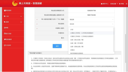 各位团员在发起团组织关系转接申请中要填写两个联系电话(本人或家人电话),确保能够随时建立联系。