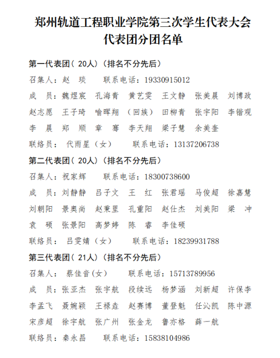 根据《中华全国学生会章程》《河南省学生联合会章程》《高校学生代表大会工作规则》的有关要求,各选举单位经班级团支部推荐提名、组织考察、最终选举产生了本次大会正式代表61名,大会代表资格审查小组已对正式当选的61名代表的产生程序和代表资格进行了认真审查。现将名单公示如下: