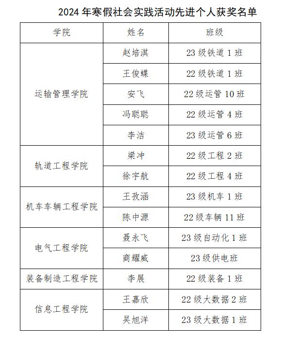 为了激励全校学生在社会实践中“学先进、争先进、当先进”,表彰先进,选树典型,引领风尚。根据校团委《关于开展我校2024年寒假“返家乡”社会实践活动总结表彰的工作通知》等相关文件精神,经学生本人申请,班级推优,学院推荐,校团委审议,现将2024年郑州轨道工程职业学院寒假社会实践活动先进个人拟获奖名单进行公示。
