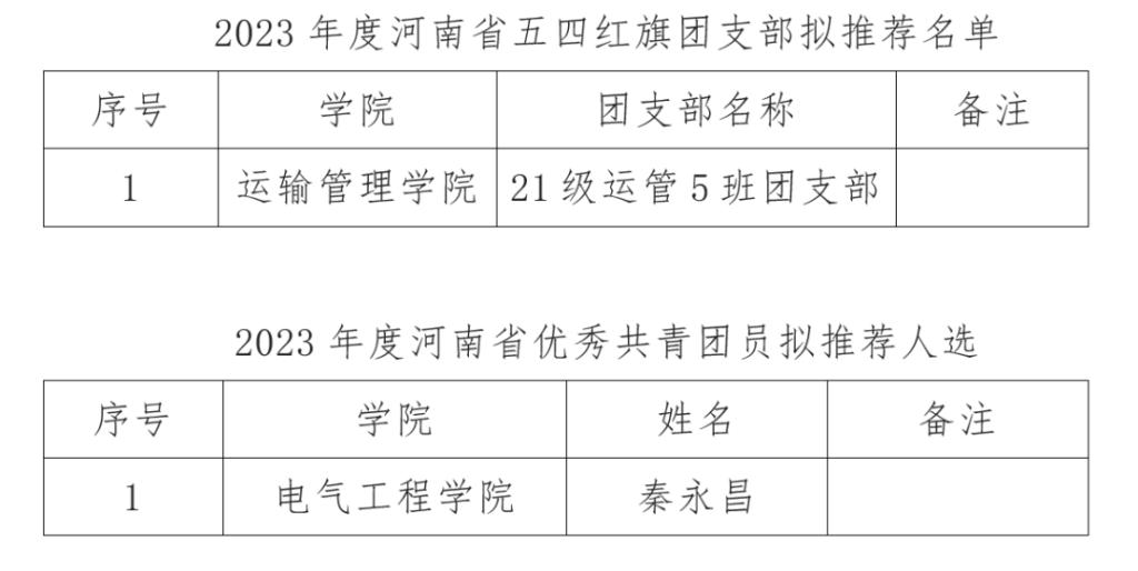 按照共青团河南省委《关于申报2023年度河南省五四红旗团委、河南省五四红旗团支部、河南省优秀共青团员、河南省优秀共青团干部的通知》豫青字〔2024〕1号的要求,经个人申请、团总支申报推荐,校团委综合评审产生拟推报参评2023年度河南省五四红旗团支部、河南省优秀共青团员名单,为充分发扬民主、广泛接受社会各界监督,现将名单予以公示。