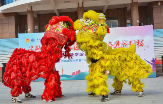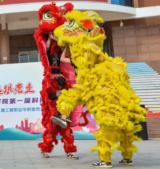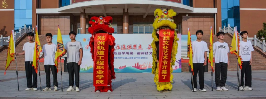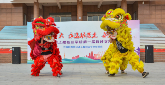 副院长周珂宣布郑州轨道工程职业学院第一届大学生科技文化艺术节正式开幕!同时,狮舞团登场表演。