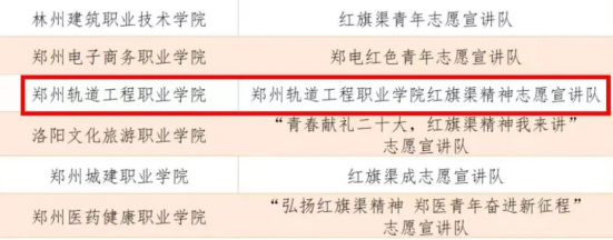 根据通知要求,在全省范围内遴选200支大学生志愿宣讲队,我校团委积极筹建宣讲团队,认真制定宣讲计划,按时提交申报材料,经团省委审核,我校“郑州轨道工程职业学院红旗渠精神志愿宣讲队”成功入选。