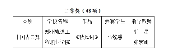 本届大学生科技文化艺术节启动以来,校团委高度重视,严格选拔,遂选出优秀作品参加省级决赛,取得优异成绩。我校学生马懿馨的作品《秋风词》获校园舞蹈大赛(业余组)二等奖,我校郭星老师、张宏妍老师获优秀指导教师荣誉。