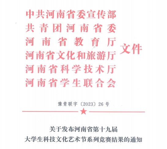 近日,省委宣传部、省教育厅、团省委、省文化和旅游厅、省科技厅、省学联联合下发了《关于发布河南省第十九届大学生科技文化艺术节系列竞赛结果的通知》。