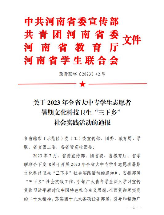 2023年我校暑期“三下乡”社会实践活动以“学习二十大 永远跟党走 奋进新征程”为主题,扎实开展“三下乡”社会实践活动,取得了显著成效,充分展现了共青团组织凝聚青年,服务大局的工作主责,为青年学生在实践活动中学知识,长才干搭建了平台,有效引导青年学生用实际行动为建设亮丽河南,共圆伟大中国梦贡献了青春力量。