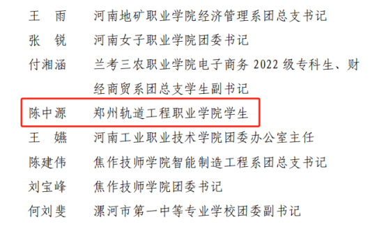 近日,省委宣传部、团省委、省教育厅、省学联对在全省2023年大中专学生志愿者暑期文化科技卫生“三下乡”社会实践活动进行总结表彰。其中,我校机车车辆工程学院团总支学生书记陈中源荣获2023年全省大中专学生志愿者暑期“三下乡”社会实践活动优秀实践个人