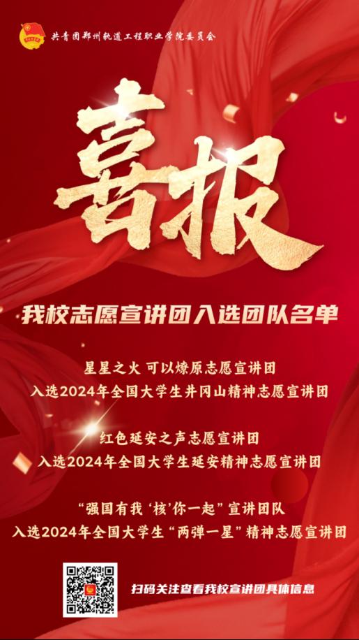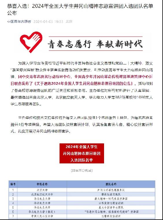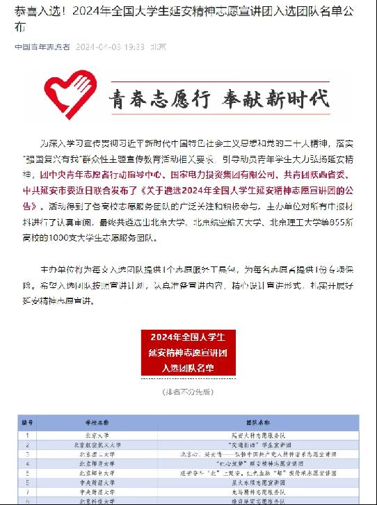 近日,团中央青年志愿者行动指导中心、国家电力投资集团有限公司、共青团陕西省委、中共延安市委、全国青少年井冈山革命传统教育基地管理中心、中国核工业集团有限公司近日联合发布了《关于遴选2024年全国大学生延安精神志愿宣讲团的公告》《关于遴选2024年全国大学生井冈山精神志愿宣讲团的公告》《关于遴选2024年全国大学生“两弹一星”精神志愿宣讲团的公告》。主办单位对所有材料进行了认真审阅,最终遴选出来自北京大学、清华大学、北京航空航天大学、北京理工大学、华北电力大学等高校的1000支大学生志愿服务团队。我校共有3支队伍入选。分别是:星星之火可以燎原志愿宣讲团、红色延安之声志愿宣讲团、“强国有我 ‘核’你一起”宣讲团队。