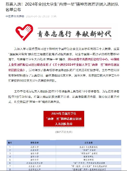 2024年全国大学生“两弹一星”精神志愿宣讲团入选团队名单(部分)