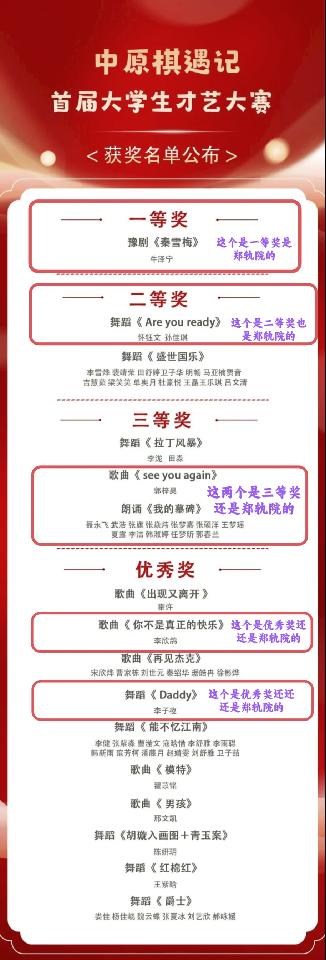 由荥阳市文化广电旅游体育局主办的“首届大学生才艺大赛”决赛,于4月20日晚在中原棋遇记正式开赛!在我校团委积极动员和指导下,共有9个节目进入决赛。经过激烈的角逐和评委们的认真评选,最终有六个节目获得奖项。此外,中原棋遇记“首届大学生才艺大赛”还设置了人气奖,我校运输管理学院的刘亚敏、怀钰文、程子艺三名同学分别荣获本次人气奖的“亚军”、“第四名”和“第六名”。感谢各学院、年级的大力配合,也祝贺所有的获奖选手!