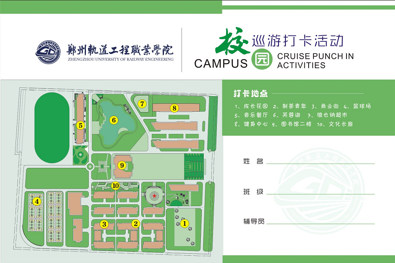 本次活动共设10个打卡点,每个打卡点均有辅导员老师和志愿者引导并辅助新生完成打卡任务。学生需完成10个点的打卡任务,集齐“郑州轨道工程职业学院“ 十字印章即算完成任务。