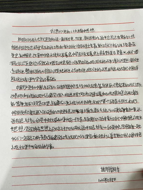 通过今天晚上的宣讲会,我深刻的了解到习近平总书记在党的二十大报告中强调,“经过不懈努力,党找到了自我革命这一跳出治乱兴衰历史周期率的第二个答案,自我净化、自我完善、自我革新、自我提高能力显著增强,管党治党宽松软状况得到根本扭转,风清气正的党内政治生态不断形成和发展,确保党永远不变质、不变色、不变味。”自我革命,是中国共产党人奋斗的雄厚底气。勇于自我革命,从严管党治党,是我们党最鲜明的品格,蕴含着共产党人接续奋斗的精神密码。