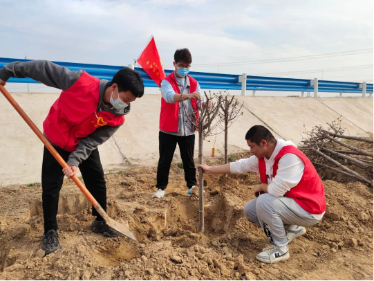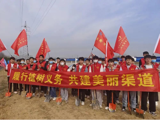 学习结束后,学生们走进水渠两岸开展植树活动。植树现场,红马甲们以饱满的热情投入到植树劳动之中,挥锹铲土、扶直苗木、培实新土,每道工序都认真细致,一丝不苟,处处都是忙碌的身影。在大家的努力之下,两百棵树苗在春风中昂然挺立,焕发出勃勃生机,为南水北调增添了清新绿意。