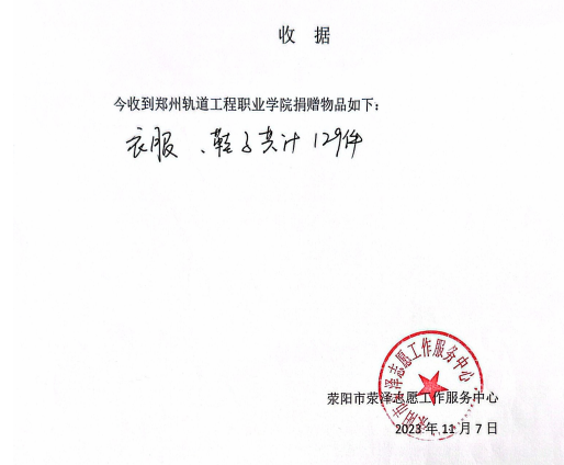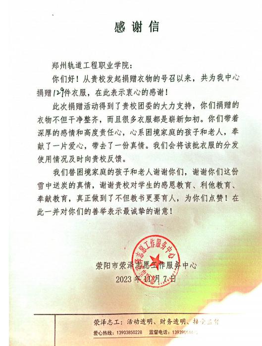 全体师生募捐衣物共129件,荥泽志愿工作服务中心发表感谢信。衣有价,爱无价,让旧衣继续发挥自己的作用,让温暖传递给下一个需要的人。本次活动旨在培养大学生的公益精神,提高大学生的社会责任感,营造和谐友爱的校园风气。