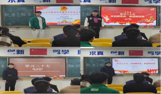 为深入学习党的二十大精神,全面贯彻习近平新时代中国特色社会主义思想,弘扬伟大建党精神,不断提升我校轨道工程系青年的思想理论水平和政治素养,郑州轨道工程职业学院轨道工程系于2023年2月17日在高层教学楼602教室举行“学习二十大,永远跟党走,奋进新征程”主题微团课大赛。出席本次活动的有轨道工程系团总支书记安艺铭老师、22级辅导员郭庆文老师。