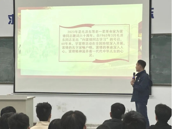 三月是一个春光明媚、生机勃勃的季节,三月更是一个讲文明、树新风,让雷锋精神吹遍校园每一个角落的季节。为深入学习、传承、弘扬雷锋精神,并响应习近平总书记“新征程上,要深刻把握雷锋精神的时代内涵”的号召,立足校园开展“学雷锋”活动,引导全体学生以实际行动践行雷锋精神,努力创建和谐校园,做文明、自信、乐观、向上的青年团员,2021级春季团总支组织开展了“弘扬雷锋精神,共创和谐校园”主题团课教育活动。此次活动由2021级春季团总支书记叶小辉主持、副书记王永杰为2023年春季全体入团积极分子和21春“1+1”志愿者服务队全员授课。