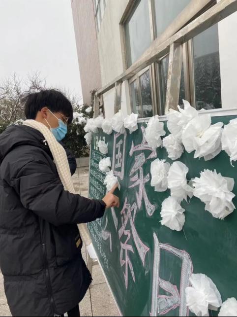 13日上午10时,校学生会在一号叫教学楼前举行默哀仪式,并为无辜杀害的死难同胞献上一朵白花。