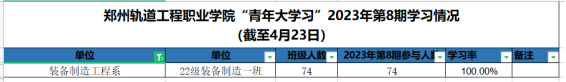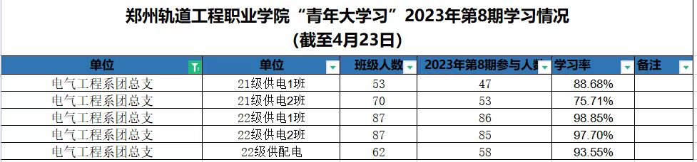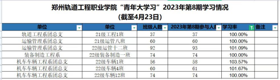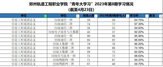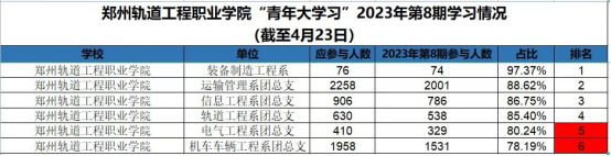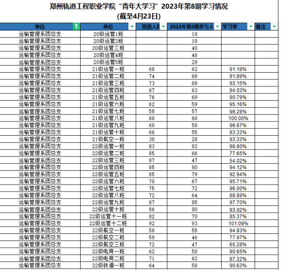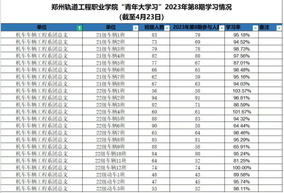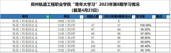 据统计,上期“青年大学习”网上主题团课中,21级工程1班、21级运管八班、22级运管十二班、22级装备制造一班、22级车辆1班、22级车辆4班、22级车辆12班以上团支部参学率榜前领跑,部分团支部完成率较低,请各系团总支学生副书记、团支部书记督促各系团支部本期青年大学习学习情况。