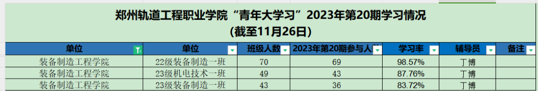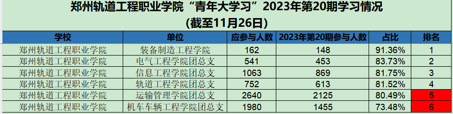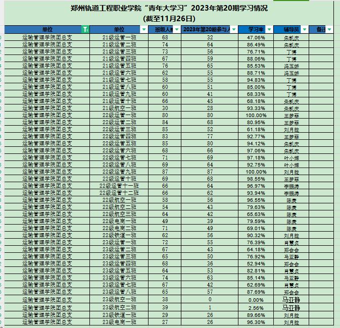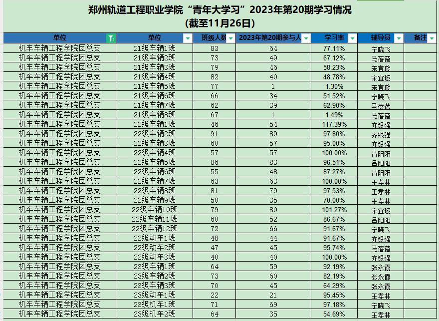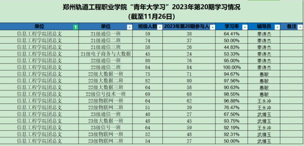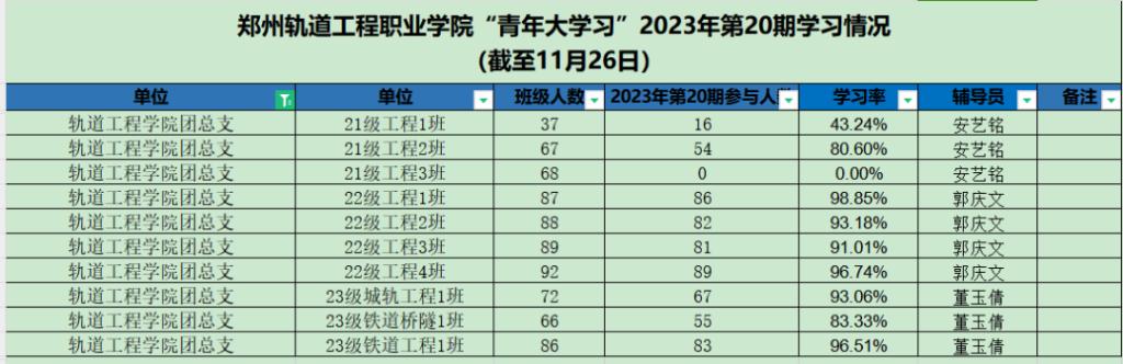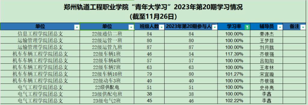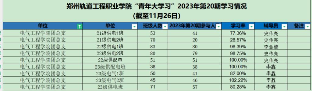 据统计,上期“青年大学习”网上主题团课中,22级车辆1班、23级电气2班、22级车辆10班、22级通信二班、22级运管一班、22级运管九班、22级车辆4班、22级车辆7班、22级动车3班、22级供配电、23级供配电班以上团支部参学率榜前领跑。上期部分团支部完成率较低,请各学院团总支学生副书记、团支部书记督促各系团支部本期青年大学习学习情况。若还存在班级名称不对的,请尽快修改,下次将通报学习率较低的团支部。