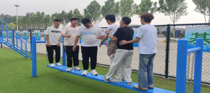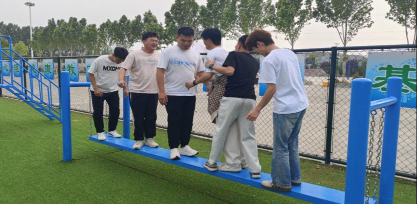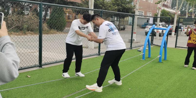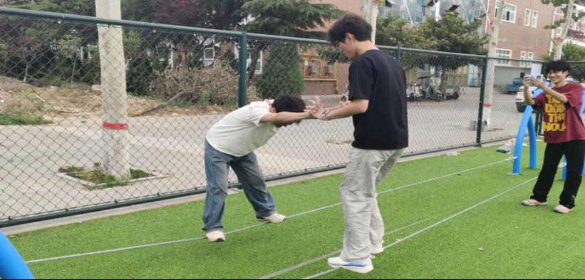 协作走钢丝项目将活动氛围推向高潮。一根细长的钢丝横跨场地,同学们需要两两一组,手拉手在钢丝上行走。这不仅考验着个人的平衡能力,更需要两人之间默契配合、相互扶持。活动中,有的小组小心翼翼、步步为营,有的小组则步伐稳健、快速通过。大家在挑战中不断调整策略,共同克服困难,进一步加深了彼此间的信任与默契。