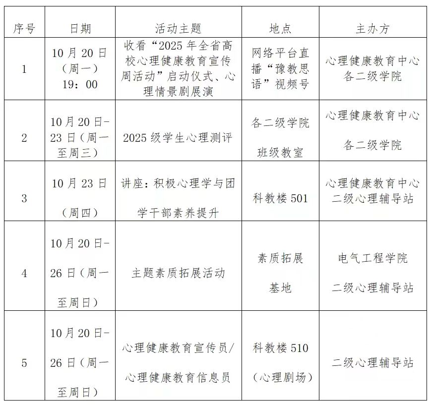 为深入学习贯彻党的二十届三中全会精神,贯彻落实习近平总书记关于加强学生心理健康教育工作的重要指示批示,根据中共河南省委教育工委办公室、河南省教育厅办公室《关于开展2025年全省高校心理健康教育宣传周活动的通知》(豫教工委办〔2025〕29号)文件精神,营造校园心理健康文化氛围,学校决定开展2025年大学生心理健康教育宣传周活动。