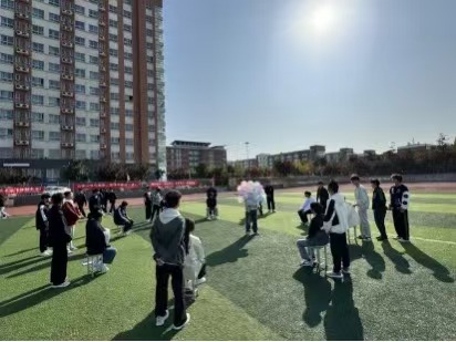 随后,同学们移步至足球场,按照每15人一组围坐成圈。活动中,任意一位同学站在圈中,喊出“大风吹”,其他同学则齐声问“吹什么”。站中间的同学需要喊出一个大家共有的明显特征,如“男生”、“戴眼镜的”、“扎辫子的”等。具备这些特征的同学需迅速起身寻找新的座位,而不具备的同学则保持不动。站在中间的同学则需趁机找到一个空位坐下。若未能找到座位,则继续留在圈中带领大家进行下一轮游戏。